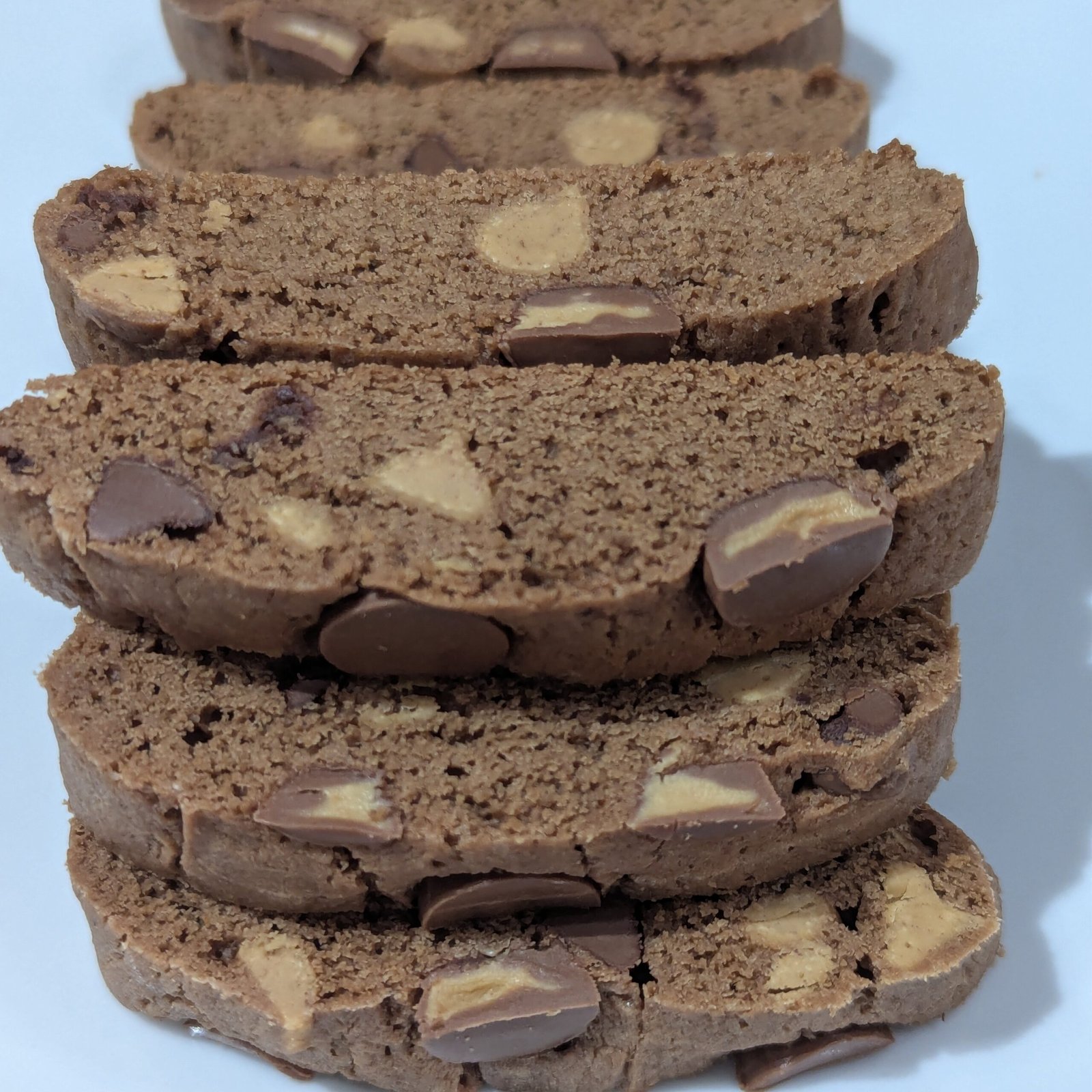 Chocolate Biscotti dough with peanut butter chips, dotted with mini peanut butter cups with Almonds for crunch.